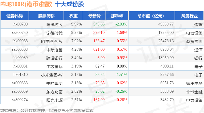 内地100R(港币)(483002)指数十大成份股详情如下: