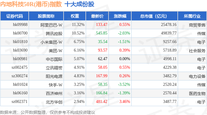 内地科技50R(港币)(483004)指数十大成份股详情如下: