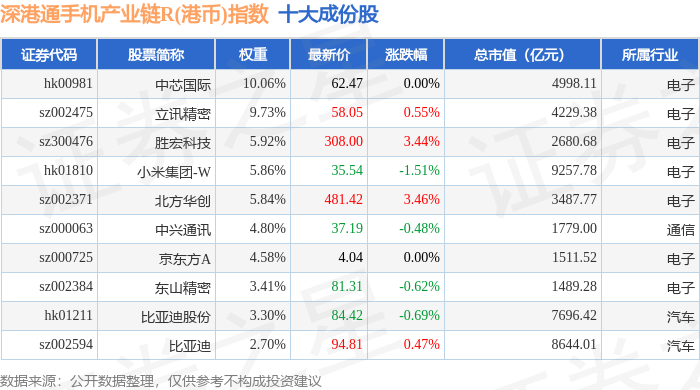 深港通手机产业链R(港币)(483010)指数十大成份股详情如下: