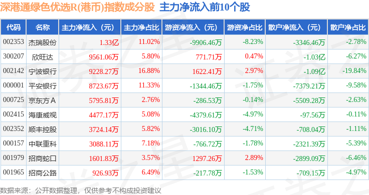 资金流向方面,深港通绿色优选R(港币)(483012)指数成份股当日主力资金净流出合计20.98亿元,游资资金净流入合计1.77亿元,散户资金净流入合计19.22亿元。成份股资金流向详情见下表: