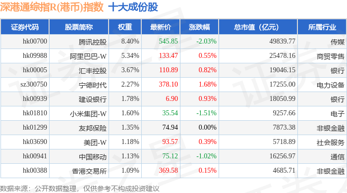 深港通综指R(港币)(483006)指数十大成份股详情如下: