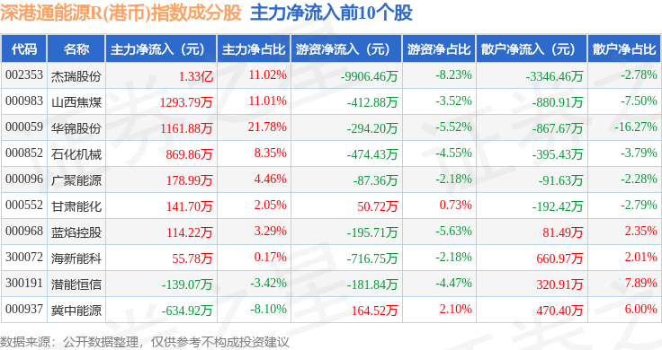 资金流向方面,深港通能源R(港币)(483014)指数成份股当日主力资金净流入合计1.15亿元,游资资金净流出合计1.23亿元,散户资金净流入合计811.55万元。成份股资金流向详情见下表: