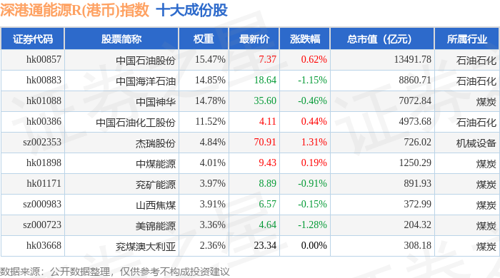 深港通能源R(港币)(483014)指数十大成份股详情如下:
