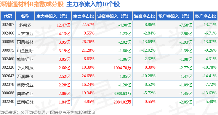 资金流向方面,深港通材料R(483015)指数成份股当日主力资金净流入合计17.25亿元,游资资金净流出合计19.13亿元,散户资金净流入合计1.88亿元。成份股资金流向详情见下表: