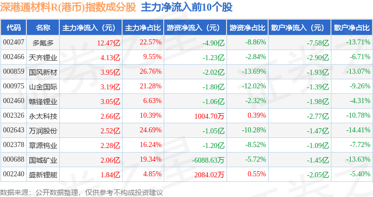 资金流向方面,深港通材料R(港币)(483016)指数成份股当日主力资金净流入合计17.25亿元,游资资金净流出合计19.13亿元,散户资金净流入合计1.88亿元。成份股资金流向详情见下表: