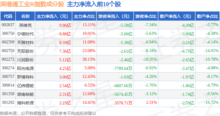 资金流向方面,深港通工业R(483017)指数成份股当日主力资金净流入合计5.19亿元,游资资金净流出合计21.54亿元,散户资金净流入合计16.35亿元。成份股资金流向详情见下表: