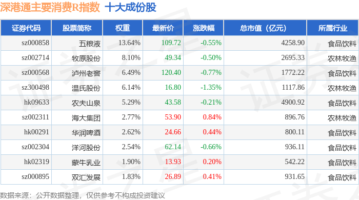 深港通主要消费R(483021)指数十大成份股详情如下: