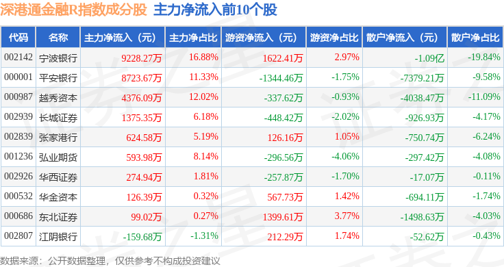 资金流向方面,深港通金融R(483025)指数成份股当日主力资金净流出合计5.46亿元,游资资金净流入合计3.55亿元,散户资金净流入合计1.91亿元。成份股资金流向详情见下表: