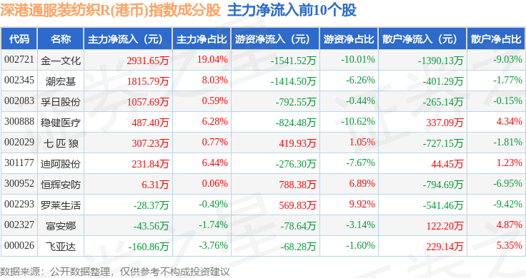 资金流向方面,深港通服装纺织R(港币)(483042)指数成份股当日主力资金净流出合计1.2亿元,游资资金净流出合计1427.66万元,散户资金净流入合计1.35亿元。成份股资金流向详情见下表: