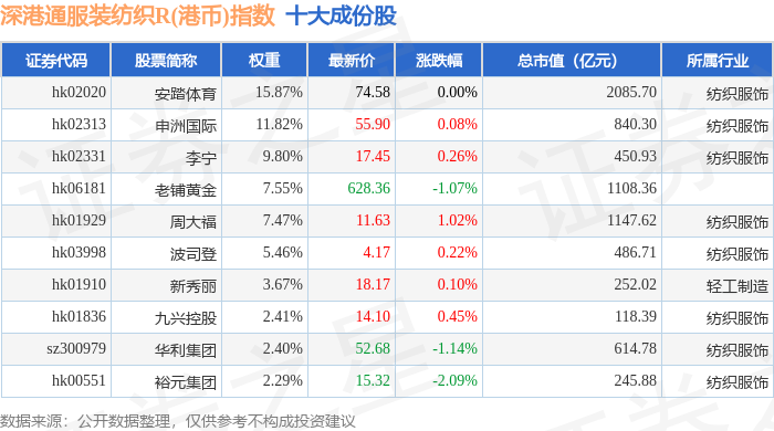 深港通服装纺织R(港币)(483042)指数十大成份股详情如下: