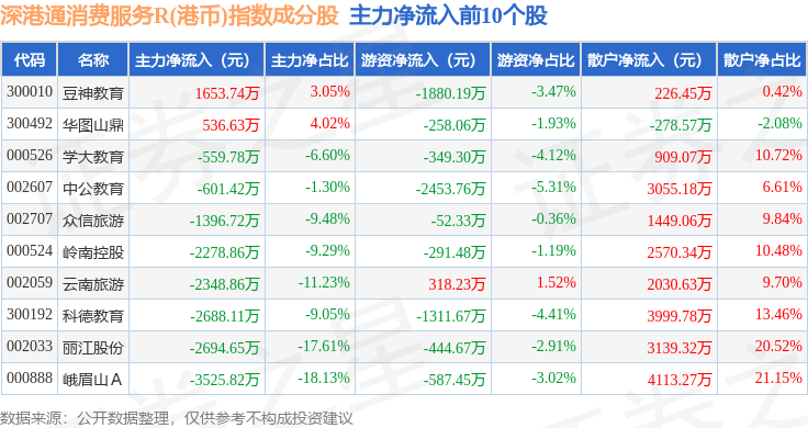 资金流向方面,深港通消费服务R(港币)(483046)指数成份股当日主力资金净流出合计5.95亿元,游资资金净流出合计3673.26万元,散户资金净流入合计6.31亿元。成份股资金流向详情见下表: