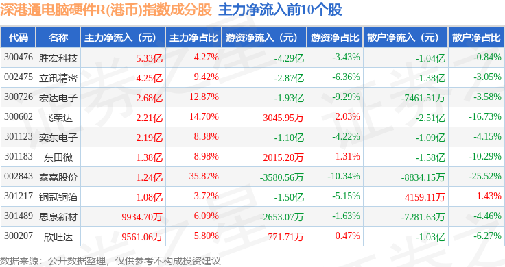 资金流向方面,深港通电脑硬件R(港币)(483044)指数成份股当日主力资金净流出合计43.48亿元,游资资金净流出合计1.4亿元,散户资金净流入合计44.88亿元。成份股资金流向详情见下表: