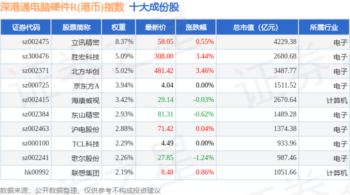 深港通电脑硬件R(港币)(483044)指数十大成份股详情如下: