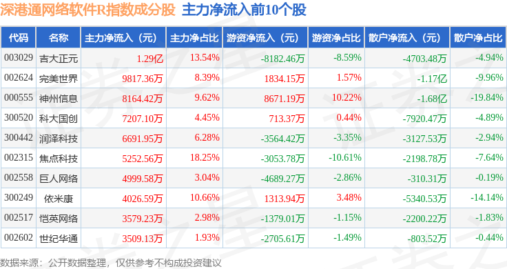 资金流向方面,深港通网络软件R(483047)指数成份股当日主力资金净流出合计24.76亿元,游资资金净流入合计5.71亿元,散户资金净流入合计19.05亿元。成份股资金流向详情见下表: