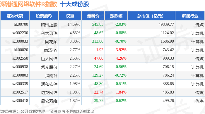 深港通网络软件R(483047)指数十大成份股详情如下: