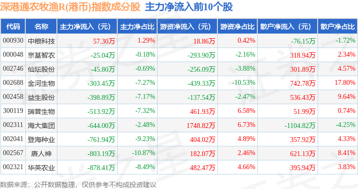 资金流向方面,深港通农牧渔R(港币)(483052)指数成份股当日主力资金净流出合计7.78亿元,游资资金净流入合计1.9亿元,散户资金净流入合计5.88亿元。成份股资金流向详情见下表: