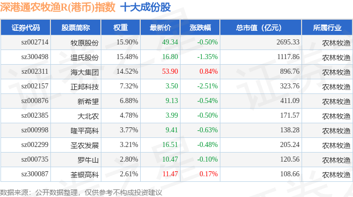 深港通农牧渔R(港币)(483052)指数十大成份股详情如下: