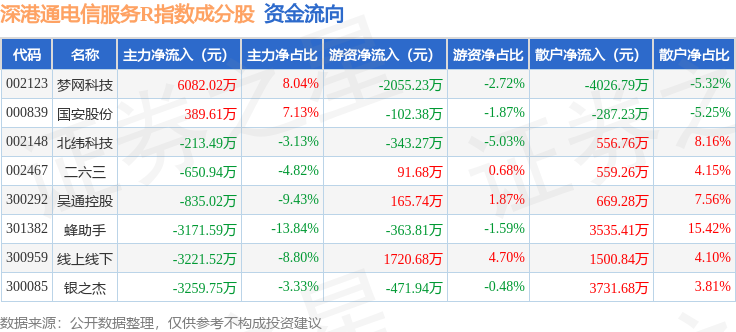 资金流向方面,深港通电信服务R(483057)指数成份股当日主力资金净流出合计4880.68万元,游资资金净流出合计1358.54万元,散户资金净流入合计6239.21万元。成份股资金流向详情见下表: