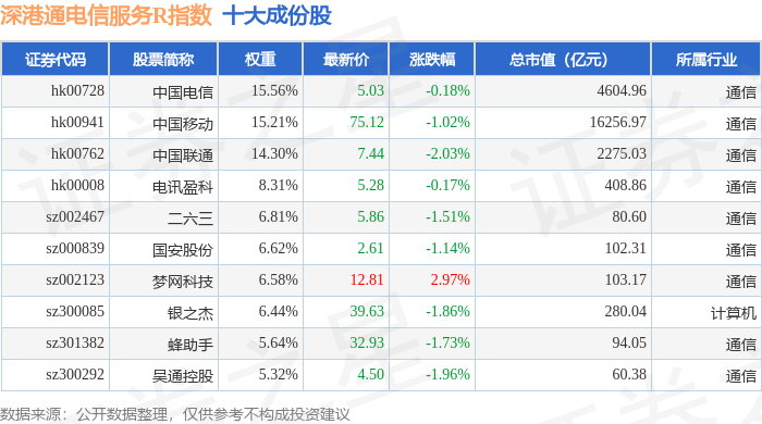 深港通电信服务R(483057)指数十大成份股详情如下: