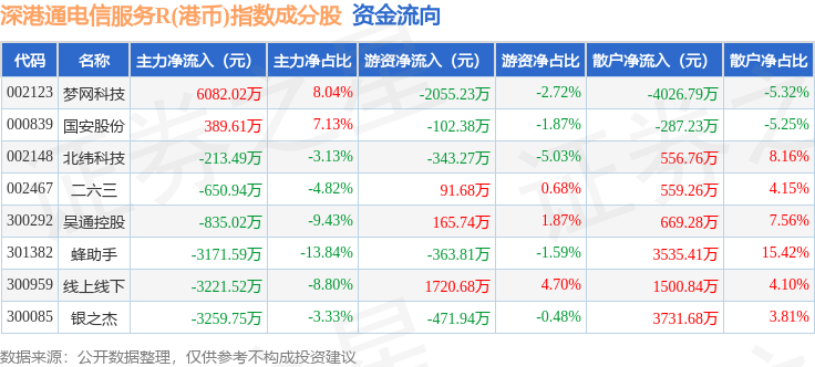 资金流向方面,深港通电信服务R(港币)(483058)指数成份股当日主力资金净流出合计4880.68万元,游资资金净流出合计1358.54万元,散户资金净流入合计6239.21万元。成份股资金流向详情见下表: