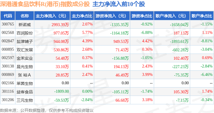 资金流向方面,深港通食品饮料R(港币)(483066)指数成份股当日主力资金净流出合计7.52亿元,游资资金净流出合计1486.73万元,散户资金净流入合计7.67亿元。成份股资金流向详情见下表: