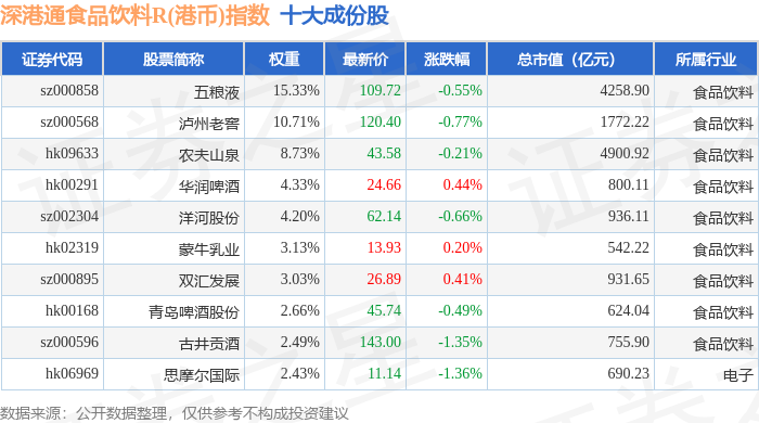 深港通食品饮料R(港币)(483066)指数十大成份股详情如下: