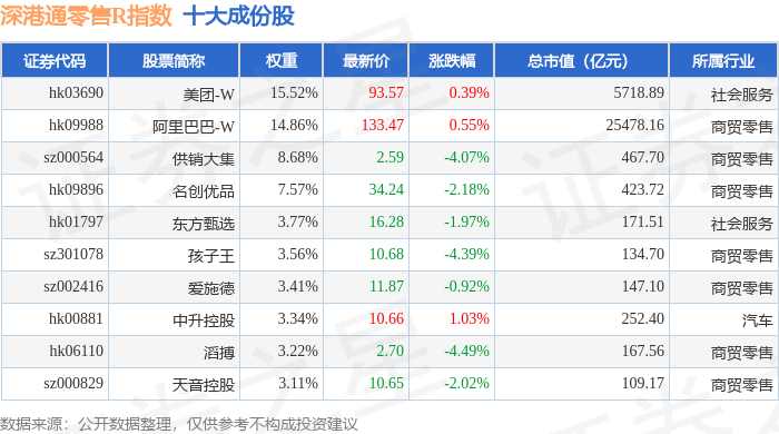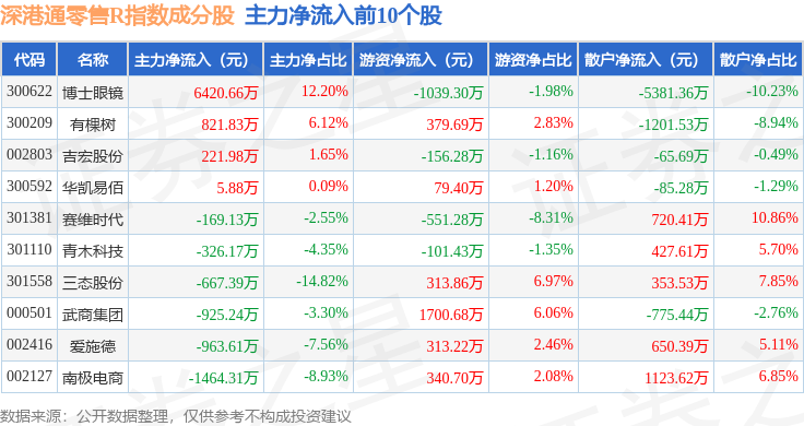 资金流向方面,深港通零售R(483073)指数成份股当日主力资金净流出合计7.76亿元,游资资金净流入合计1.31亿元,散户资金净流入合计6.46亿元。成份股资金流向详情见下表: