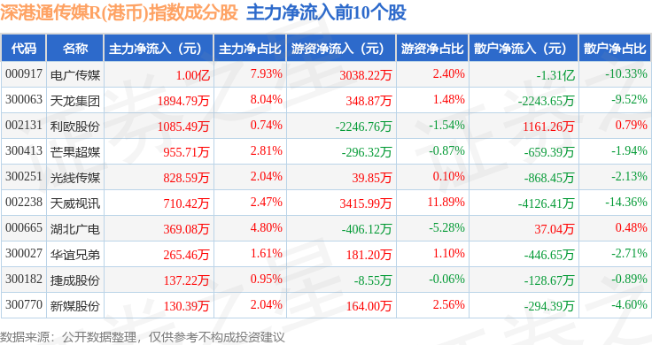 资金流向方面,深港通传媒R(港币)(483076)指数成份股当日主力资金净流出合计12.34亿元,游资资金净流入合计2.14亿元,散户资金净流入合计10.2亿元。成份股资金流向详情见下表: