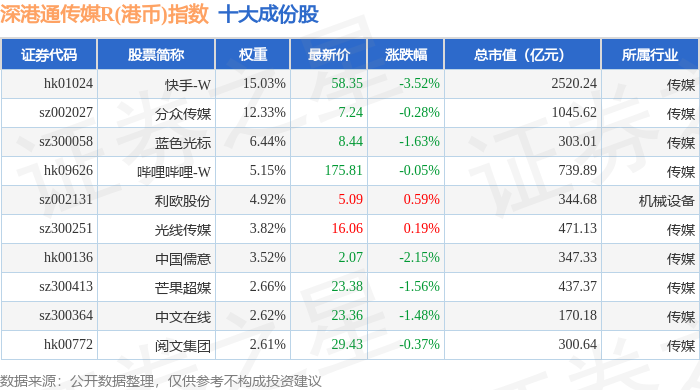 深港通传媒R(港币)(483076)指数十大成份股详情如下: