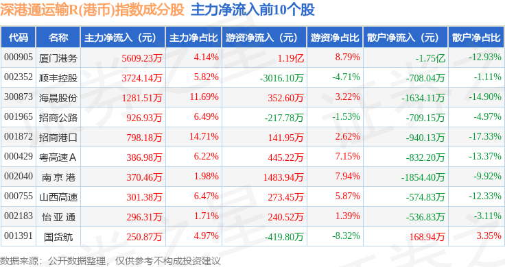 资金流向方面,深港通运输R(港币)(483078)指数成份股当日主力资金净流出合计3.32亿元,游资资金净流入合计9999.86万元,散户资金净流入合计2.32亿元。成份股资金流向详情见下表: