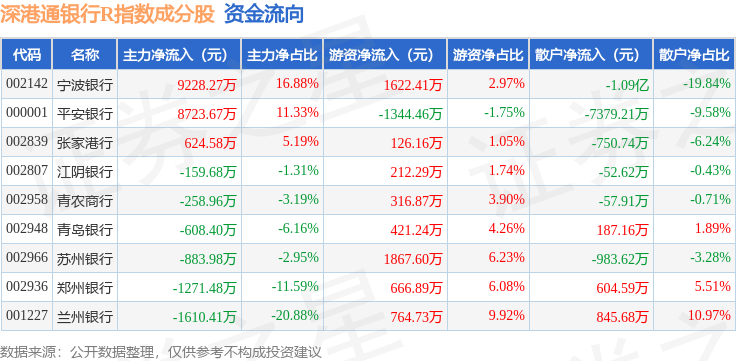 资金流向方面,深港通银行R(483081)指数成份股当日主力资金净流入合计1.38亿元,游资资金净流入合计4653.72万元,散户资金净流出合计1.84亿元。成份股资金流向详情见下表: