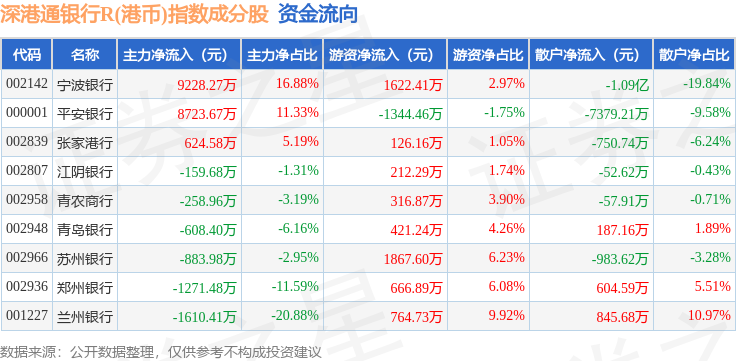 资金流向方面,深港通银行R(港币)(483082)指数成份股当日主力资金净流入合计1.38亿元,游资资金净流入合计4653.72万元,散户资金净流出合计1.84亿元。成份股资金流向详情见下表:
