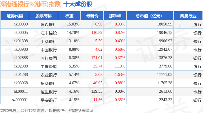 深港通银行R(港币)(483082)指数十大成份股详情如下: