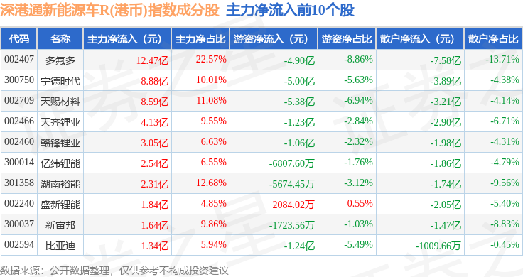 资金流向方面,深港通新能源车R(港币)(483088)指数成份股当日主力资金净流入合计43.84亿元,游资资金净流出合计21.25亿元,散户资金净流出合计22.59亿元。成份股资金流向详情见下表: