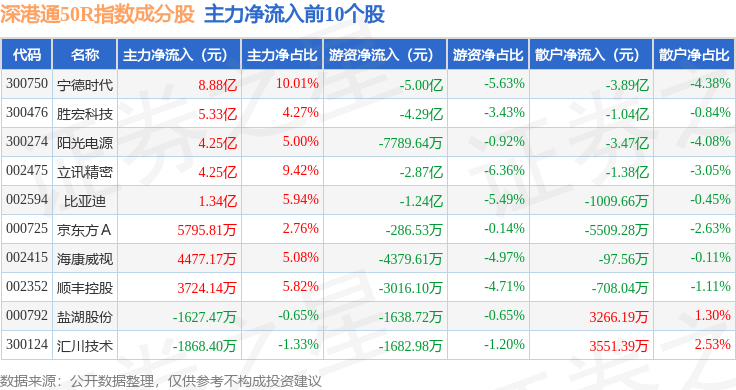资金流向方面,深港通50R(483091)指数成份股当日主力资金净流入合计4.67亿元,游资资金净流出合计6.09亿元,散户资金净流入合计1.42亿元。成份股资金流向详情见下表: