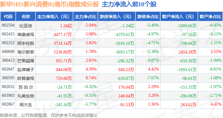 资金流向方面,新华SHS新兴消费R(港币)(489007)指数成份股当日主力资金净流出合计10.79亿元,游资资金净流入合计5708.5万元,散户资金净流入合计10.22亿元。成份股资金流向详情见下表: