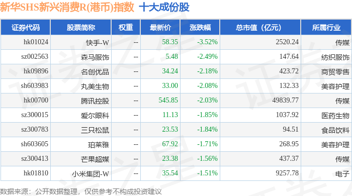 新华SHS新兴消费R(港币)(489007)指数十大成份股详情如下: