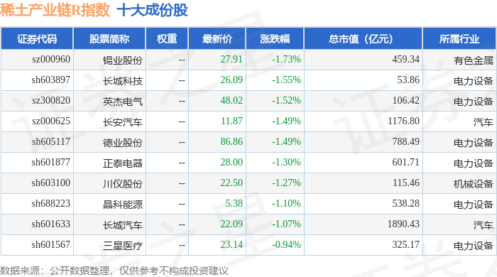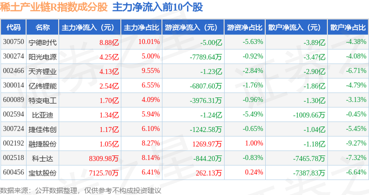 资金流向方面,稀土产业链R(489013)指数成份股当日主力资金净流入合计21.56亿元,游资资金净流出合计13.6亿元,散户资金净流出合计7.96亿元。成份股资金流向详情见下表: