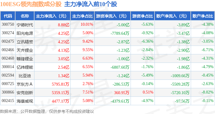 资金流向方面,100ESG领先(970030)指数成份股当日主力资金净流出合计12.27亿元,游资资金净流出合计1.45亿元,散户资金净流入合计13.71亿元。成份股资金流向详情见下表: