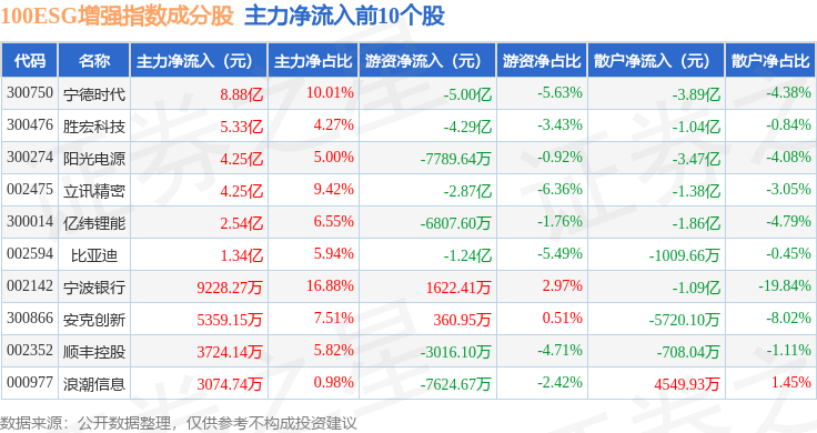 资金流向方面,100ESG增强(970033)指数成份股当日主力资金净流出合计3.44亿元,游资资金净流出合计4.67亿元,散户资金净流入合计8.11亿元。成份股资金流向详情见下表: