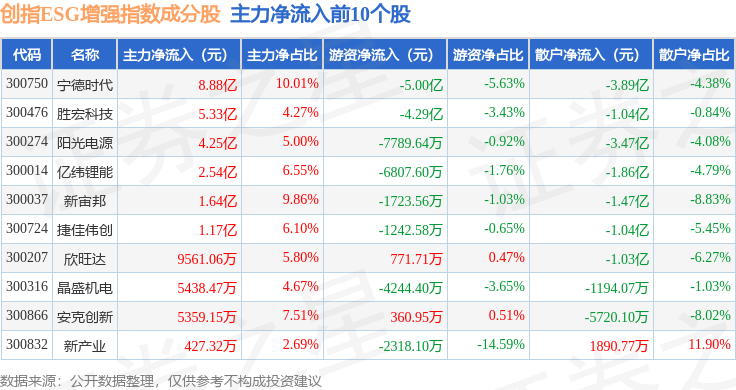 资金流向方面,创指ESG增强(970034)指数成份股当日主力资金净流出合计15.26亿元,游资资金净流入合计6.72亿元,散户资金净流入合计8.55亿元。成份股资金流向详情见下表: