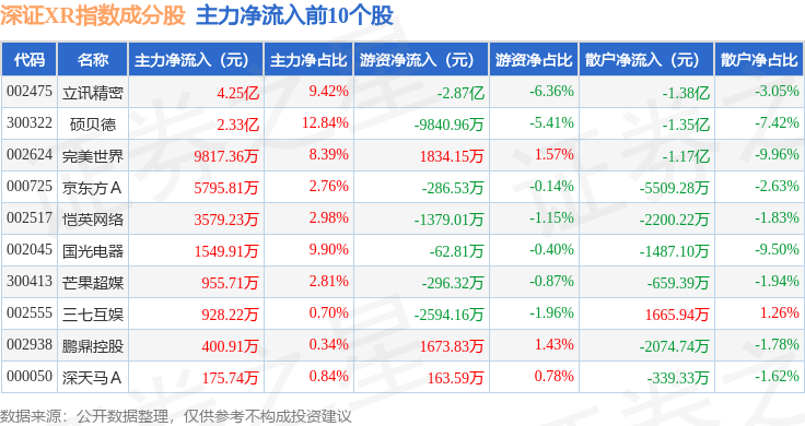资金流向方面,深证XR(970046)指数成份股当日主力资金净流出合计25.85亿元,游资资金净流入合计6003.27万元,散户资金净流入合计25.25亿元。成份股资金流向详情见下表: