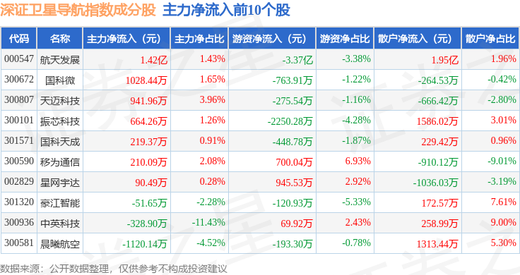 资金流向方面,深证卫星导航(970050)指数成份股当日主力资金净流出合计36.85亿元,游资资金净流入合计1.2亿元,散户资金净流入合计35.65亿元。成份股资金流向详情见下表: