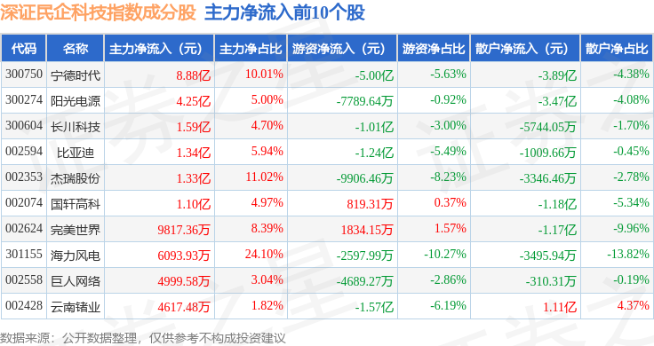 资金流向方面,深证民企科技(970059)指数成份股当日主力资金净流出合计7.86亿元,游资资金净流出合计10.52亿元,散户资金净流入合计18.38亿元。成份股资金流向详情见下表: