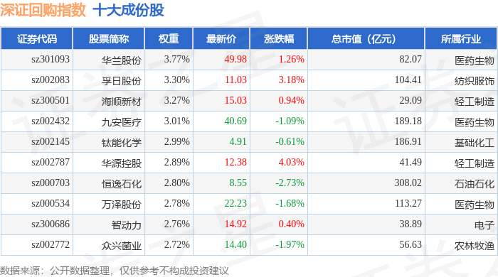 深证回购(970063)指数十大成份股详情如下: