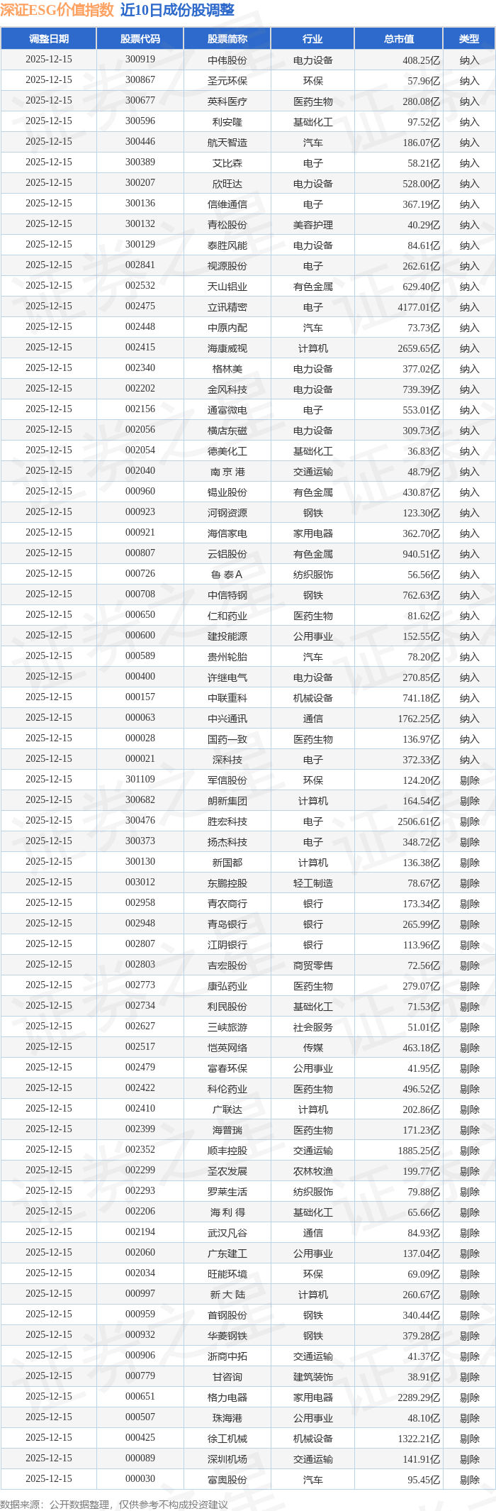 深证ESG价值(970061)指数十大成份股详情如下: