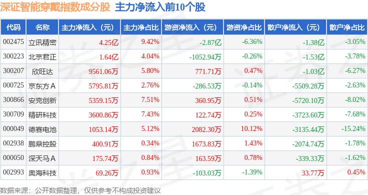 资金流向方面,深证智能穿戴(970074)指数成份股当日主力资金净流出合计30.4亿元,游资资金净流入合计3.58亿元,散户资金净流入合计26.82亿元。成份股资金流向详情见下表: