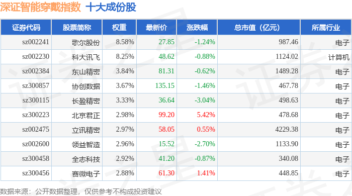 深证智能穿戴(970074)指数十大成份股详情如下: