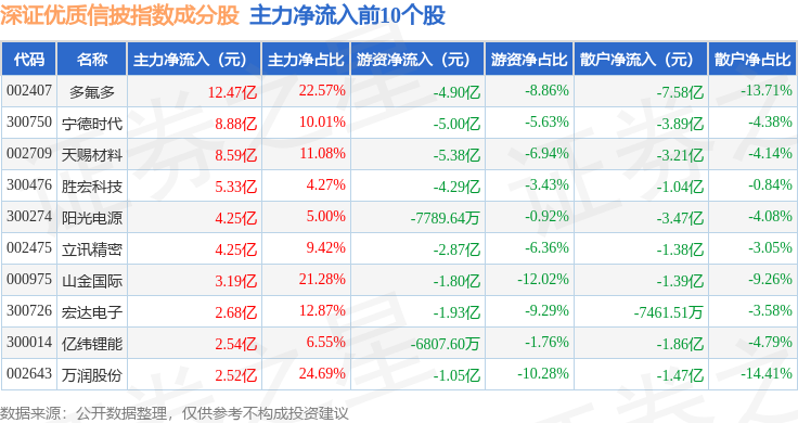 资金流向方面,深证优质信披(970065)指数成份股当日主力资金净流出合计59.68亿元,游资资金净流出合计13.11亿元,散户资金净流入合计72.79亿元。成份股资金流向详情见下表: