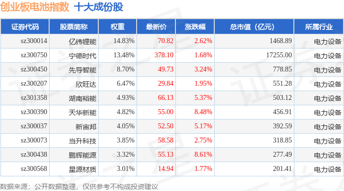 创业板电池(970081)指数十大成份股详情如下: